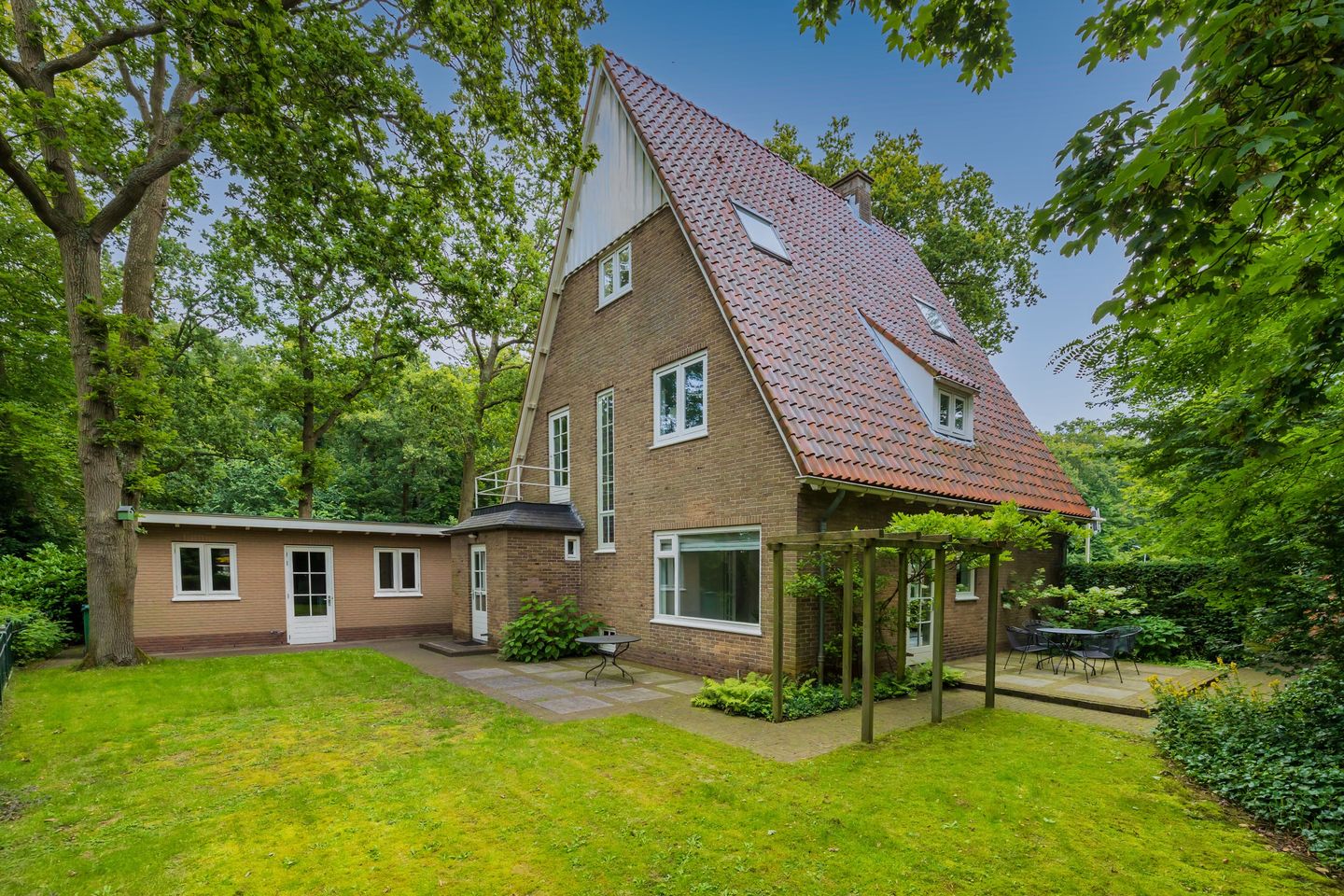 De ruime tuin rondom biedt talloze mogelijkheden voor ontspanning en recreatie. Denk bijvoorbeeld aan verschillende terrassen waar u kunt genieten van het zonnetje of gezellig kunt barbecueën met vrienden en familie. Maar niet alleen volwassenen hebben baat bij een mooie tuin, ook kinderen kunnen hier volop plezier beleven. Met voldoende ruimte om te rennen, spelen en ravotten, is er altijd iets te beleven in de tuin. Het huis is gebouwd op een oud duin, wat maakt dat de tuin een glooiend en speels karakter heeft, met mooie oude bomen. De tuin heeft verder een beregeningssysteem met eigen bron.