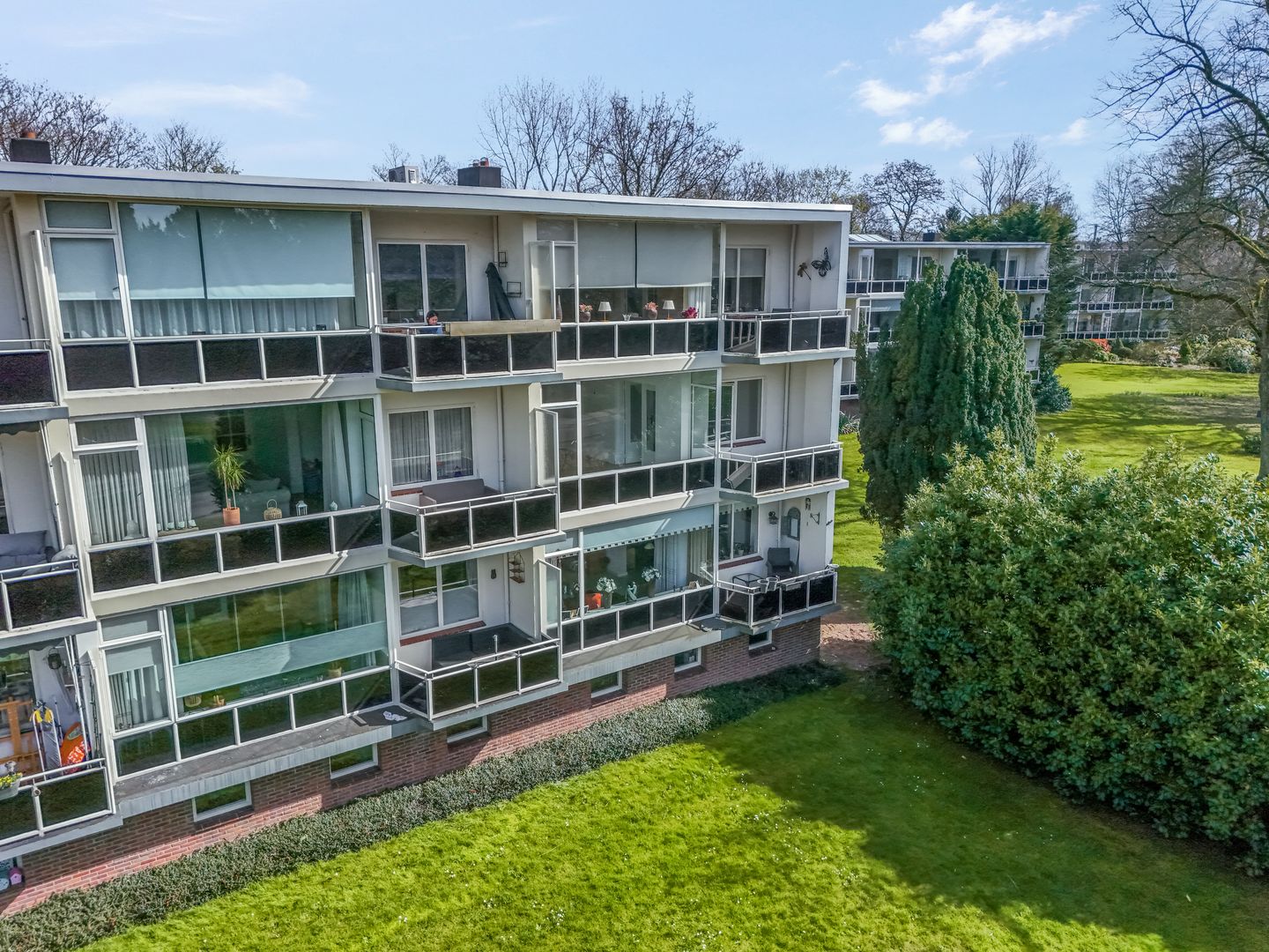 Bij de keuken is een balkon op het oosten en het tweede balkon, te bereiken vanuit de woonkamer, is op het westen. Vanaf beide balkons is er mooi uitzicht op het groen, en aan de achterkant zie je ook de monumentale villa ‘Oud Vossenhol’ uit 1912, niet te verwarren met villa ‘Klein Vossenhol’ die naast het appartementengebouw staat.