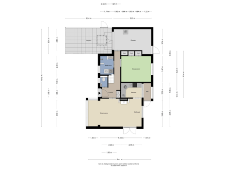 Via de voordeur komt u in de lange hal, die toegang geeft tot de verschillende vertrekken, het toilet met fonteintje en de trapopgang naar de verdieping. Aan het einde van de hal bereikt u de garage met aangebouwde carport, die tevens toegang biedt tot de tuin.