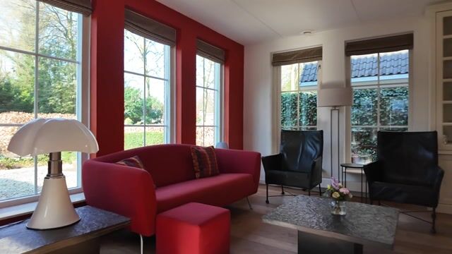 De royale living ademt sfeer en elegantie. Houten vloerdelen, grote raampartijen en het weidse uitzicht op het groen zorgen voor een harmonieuze verbinding met buiten. Het daglicht stroomt rijkelijk naar binnen en laat de natuur als het ware deel uitmaken van uw interieur. De klassieke boekenkast met gashaard vormt een warm middelpunt — een plek voor lange avonden bij het vuur, omringd door boeken en stilte.