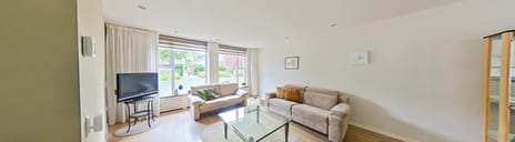 This spacious through-living room features a warm wooden parquet floor and benefits from abundant natural light thanks to large windows at both the front and rear of the house. At the front, a manually operated sunshade has been installed, allowing you to easily control the amount of light. Built-in, dimmable spotlights in both the living room and the kitchen provide pleasant and atmospheric lighting.