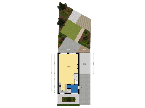 Begane grond: Hal, toilet, woonkamer met eetkamer, open keuken, toegang tot achtertuin, garage