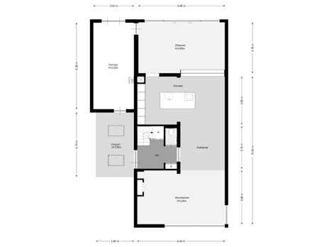 Begane grond: entree, twee livings, open woonkeuken, toilet, berging, garage.