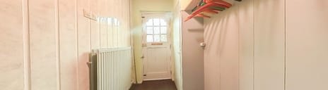De keuken grenst aan de hal, waar zich ook het toilet en de trap naar de bovenverdieping bevinden.