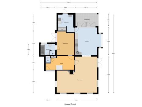 Begane grond: hal met entree, toilet, meterkast met gas-/elektra-/watermeter, telefoonaansluiting (deze wordt ook gebruikt voor de internetverbinding), hoofdslaapkamer met badkamer voorzien van separate douche, wastafel en ligbad, woonkamer (ca. 55 m²) met schouw en openhaard, woonkeuken met ruim keukenblok, erker en openslaande deuren naar het achterterras (deels overdekt), bijkeuken met garderobe, kastenwand en wasmachine- en droger aansluiting en achteruitgang naar buitenterras.