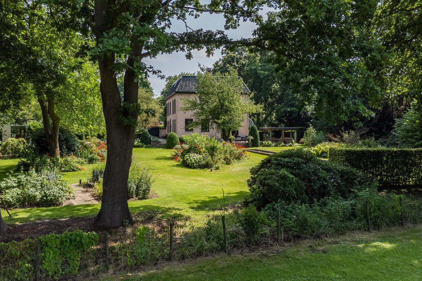 De parkachtige tuin is met behoud van eeuwenoude bomen onder architectuur aangelegd en wordt met zorg onderhouden, de tuin loopt naadloos over in een weiland met fruitbomen. U ervaart een ultieme privacy aangezien de belendende percelen op ruime afstand zijn gelegen. Afhankelijk van het weer en het moment van de dag kunt u altijd op een van de terrassen tot rust komen. Beschut dicht bij de keuken en het bakhuisje of onder het prieeltje onder de linde boom. Het robuust gebouwde overdekte terras geeft u een prachtig zicht over de tuin richting het weiland.