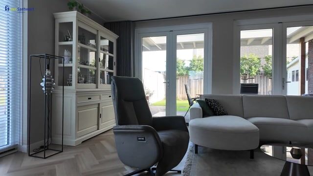 The luxurious living room has large triple-glazed windows, allowing plenty of natural light to enter. The living room and open kitchen are separated by stylish, luxurious steel doors. From the living room, there is direct access to the garden through double French doors, which seamlessly connect the indoors and outdoors.