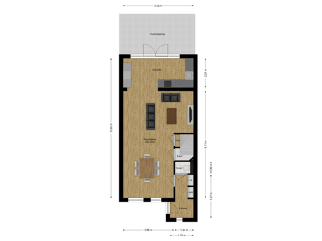 Via de entree komt u in de hal met meterkast en toiletruimte. Vanuit de hal is er toegang tot de woonkamer. De woonkamer is ruim en licht opgezet en beschikt over een prettige indeling met ruimte voor zowel een zithoek als een eethoek. De living is voorzien van vloer verwarming en in 2022 is hier een nieuwe PVC- vloer aangebracht, wat zorgt voor extra comfort en een strakke uitstraling. Grote raampartijen en de achterpui in de keuken zorgen voor een fijne verbinding met de tuin. De trapopgang naar de eerste verdieping is bereikbaar uit de woonkamer.