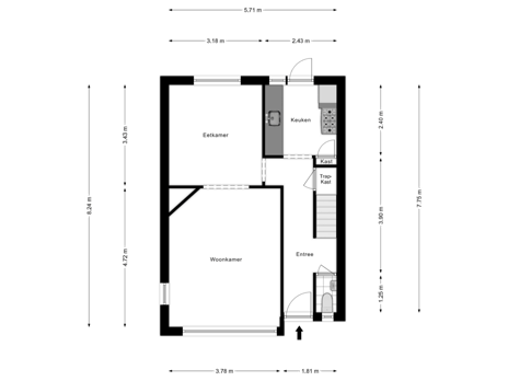 Begane grond: Entree, hal met meterkast en trapkast, spa toilet met fonteintje, gesloten keuken, woonkamer en suite met zit- en eetgedeelte.