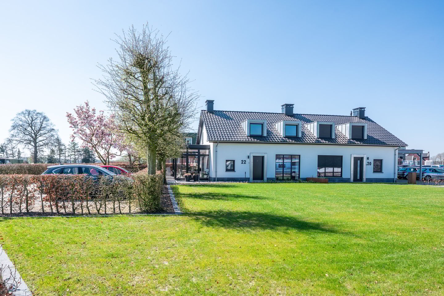 Aan de zijkant van de woning is een grote overkapping. Hier kijk je uit over de landerijen. De beukenhaag geeft de nodige privacy. Aan de voorzijde is gazon met ook een beukenhaag (recent geplant, 2025). Het afsluitbare stukje grond aan de voorzijde heeft een kersenboom en leent zich perfect voor het houden van bijvoorbeeld kippen.