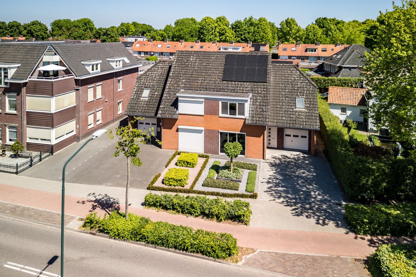 Fraai aangelegde voortuin met siergrind, vaste beplanting, taxushaag en een riante oprit met plaats voor meerdere voertuigen.