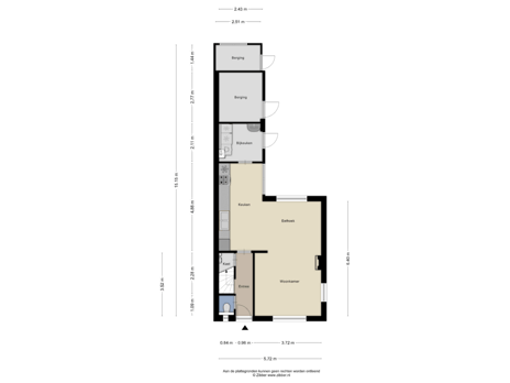 Entree/hal met meterkast, trapopgang, kelderkast en toilet. De woonkamer beschikt over veel lichtinval, schoorsteenmantel en een keukenblok met diverse inbouwapparatuur, o.a. een gaskookplaat, afzuigkap, combimagnetron en een koelkast. Via de bijkeuken bereikt u de achtertuin.