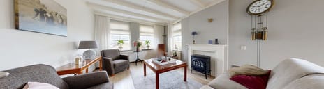 Woonkamer: De woonkamer straalt warmte en gezelligheid uit en is voorzien van een karakteristiek balkenplafond. De erker aan de zijkant biedt een prachtig uitzicht over het polderlandschap, wat een gevoel van rust en vrijheid geeft. Airconditioning zorgt voor een aangename temperatuur en de gashaard voegt extra sfeer toe op koude dagen. Houten kozijnen met dubbelglas en een klassieke roedeverdeling maken het geheel compleet. Vanuit de woonkamer is er directe toegang tot de keuken. De ruimte is afgewerkt met een laminaatvloer, glasvlies behangwanden en een balkenplafond.