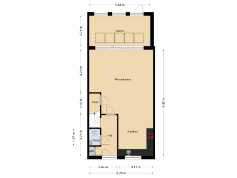 De woonkamer is samen met de keuken lekker ruim, zo'n 42 m2. Doordat de woonkamer aan de achterzijde met een serre is uitgebreid oogt het nog ruimer. Er is meer dan voldoende ruimte voor een royale zithoek. Op de vloer ligt een mooie houten vloerafwerking en de wanden zijn gestuct De uitbouw heeft een fijne lichtstraat die, naast extra lichtinval, ook samen met de mooie schuifdeuren, extra sfeer toevoegt. De serre is groot genoeg om een eethoek te plaatsen. De vloer van de serre is uitgevoerd met vloerverwarming.