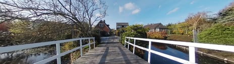 De woning is via een gezamenlijke toegangsbrug bereikbaar en beschikt aan de voorzijde over een fraai aangelegde tuin met eigen parkeergelegenheid. De groene tuin grenst aan het water en is voorzien van een mooie houten vlonder en een robuuste overkapping van Douglas hout — een heerlijke plek om in alle rust van het buitenleven te genieten.