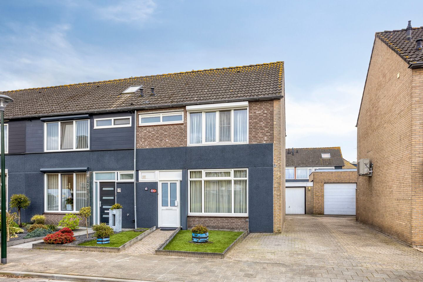 De voortuin is verzorgd aangelegd met kunstgras gazonnetjes en een diepe oprit met ruimte voor meerdere auto’s. Vanaf de oprit is er via een poort een achterom naar de overkapping direct achter de woning. Deze royale overkapping met tegelvloer is een mooie verlenging van de woonkamer. Door middel van twee lichtkoepels en twee raampartijen met dubbele beglazing is er volop lichtinval. Het geheel kan desgewenst worden afgesloten met kunststof doeken.