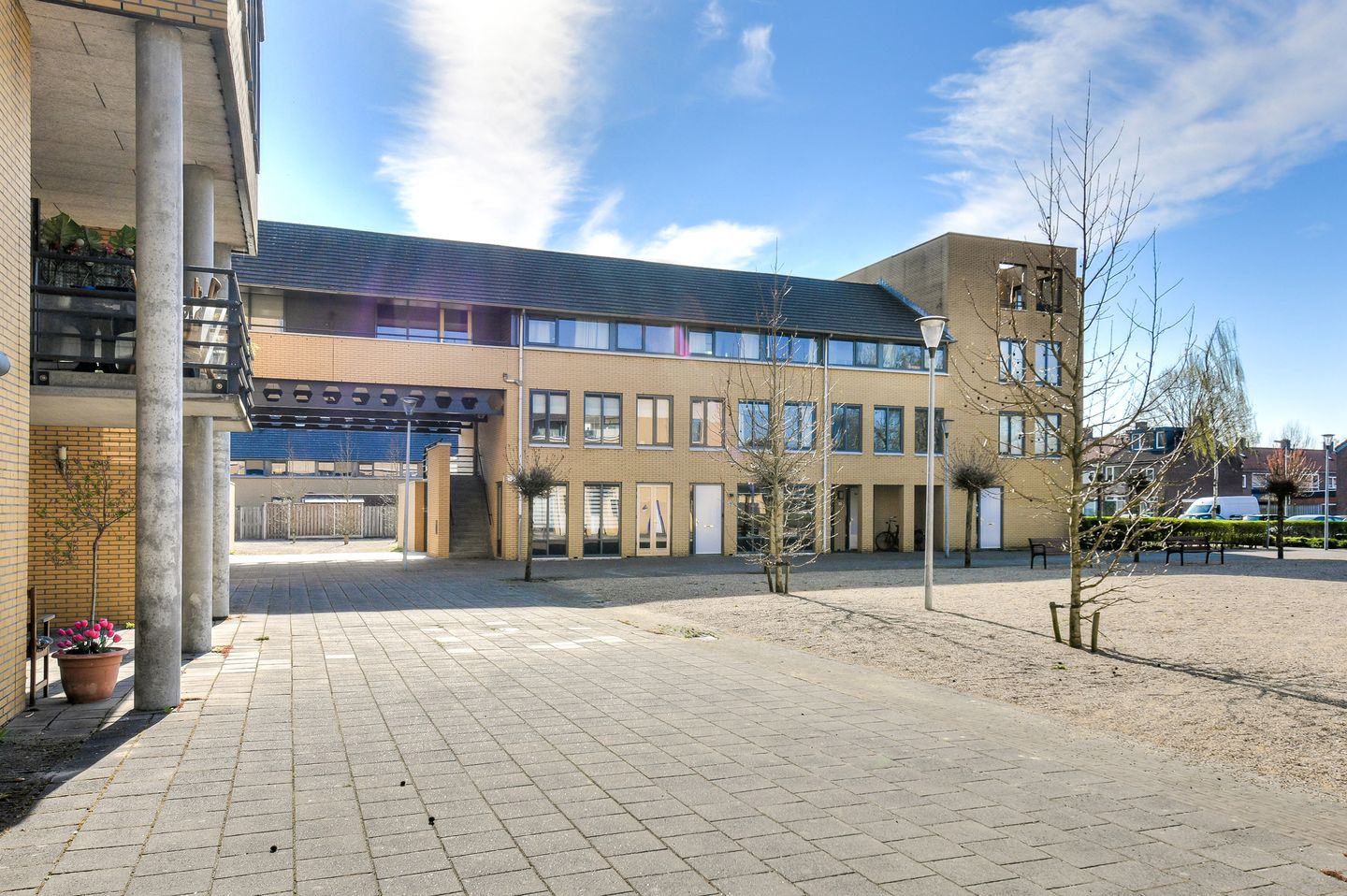 De ruime, lichte woonkamer met openslaande deuren biedt toegang tot het gezamenlijke binnenplein. In de ruimte geniet je van veel lichtinval door de grote raampartijen.