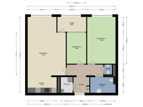 Entree-/hal met toegang tot de twee slaapkamers, woonkamer/-keuken, badkamer, berging en geheel betegelde toiletruimte met wandcloset en fonteintje.