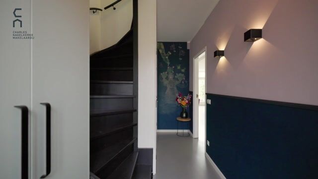 Je komt binnen in een verzorgde hal met maatwerk kastenwand en een moderne meterkast. Hier bevinden zich tevens de trapopgang, trapkast en een strak afgewerkte toiletruimte met zwevend toilet.
