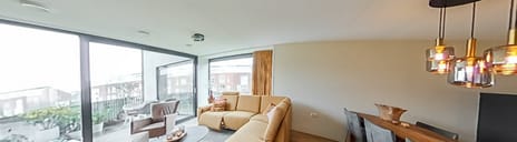 De living heeft een grote glazen pui naar het zonnige terras aan de achterzijde, welke gelegen is op het zuiden en waardoor er veel lichtinval is, zeker ook omdat er een extra raam aan de zijkant van de woning zit. Het terras heeft aan de zijkant van het terras een glazen schuifdeur is om heerlijk uit de wind te zitten. Het terras geeft een fraai zicht over groen en een waterpartij. Wat is het hier heerlijk toeven tot in de late uurtjes. In de woonkamer is airco aanwezig en de gordijnen zijn op afstand bedienbaar, evenals de zonnescreen van het zijraam.