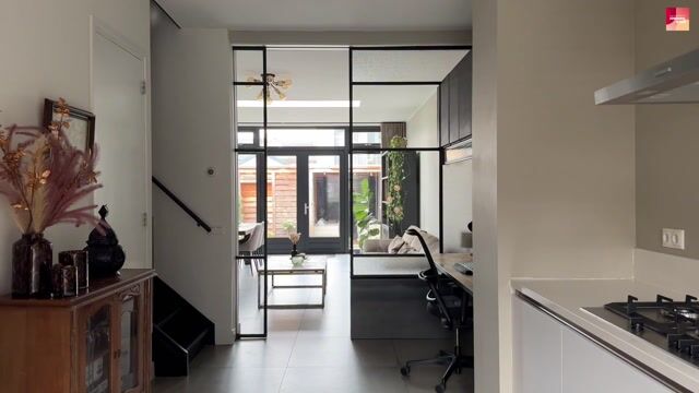 Via een stalen schuifdeur kom je in de sfeervolle woonkamer. Dankzij de lichtstraat en de openslaande tuindeuren is het hier heerlijk licht. De achtertuin is verzorgd aangelegd met terras, vaste bloembakken, een veranda en een ruime berging met deur naar het achterom. De begane grond is voorzien van vloerverwarming.