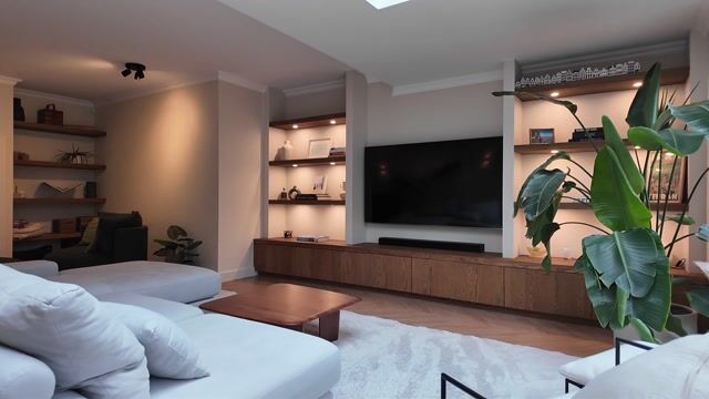 De uitgebouwde, lichte woonkamer is perfect om te ontspannen met familie en vrienden. De gezellige open haard en het fraaie tv-meubel met houten planken en verlichting geven extra sfeer aan de woonkamer. De dubbele openslaande deuren en een lichtstraat in de uitbouw zorgen voor natuurlijk licht.