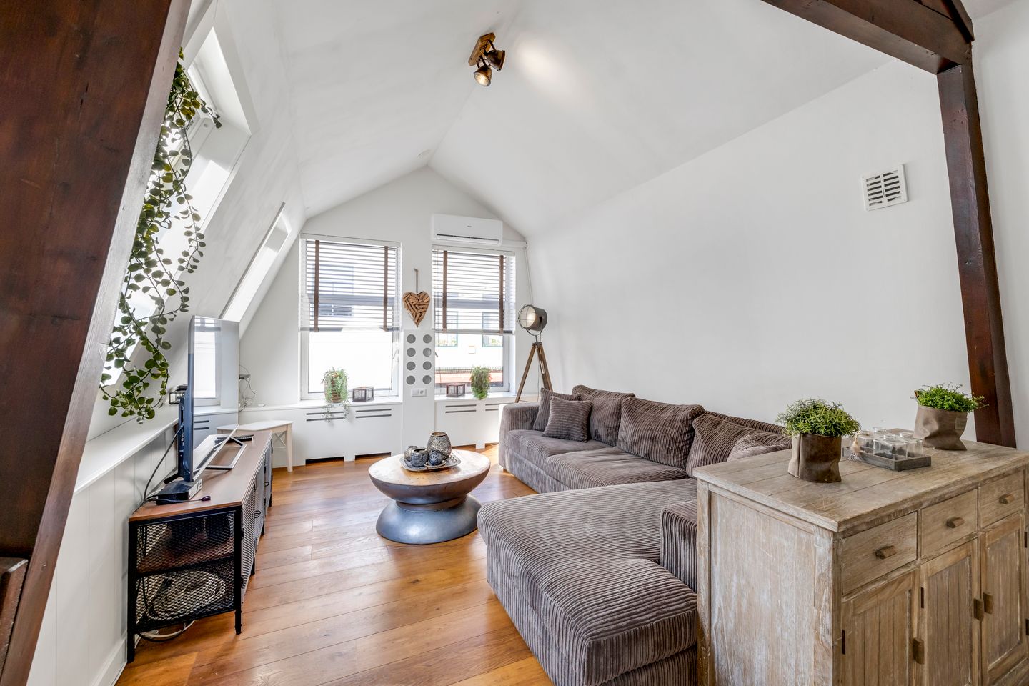 De ruime woonkamer v.v. airconditioning is gelegen aan de Voorstraatzijde. Door het hoge plafond, de grote raampartij en de dakramen is het hier heerlijk licht. Ook hier is de vloer v.v laminaat.