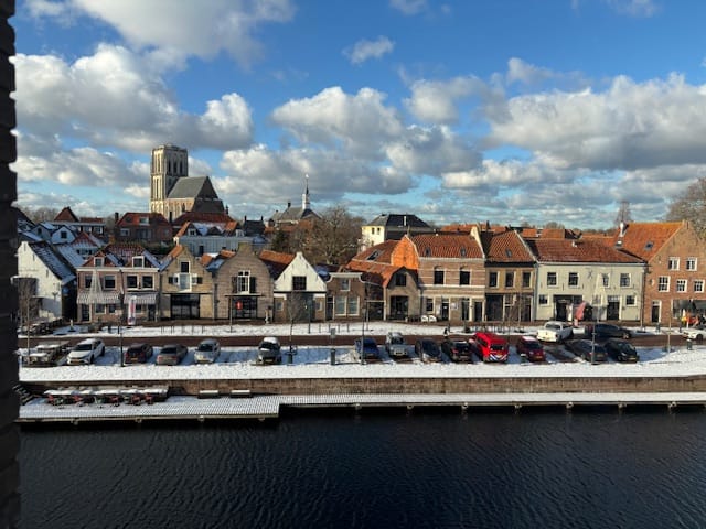 living met ramen tot op de grond,via schuifpui naar royaal dakterras (19m²) met een prachtig uitzicht over de Brielse binnenstad en jachthaven);