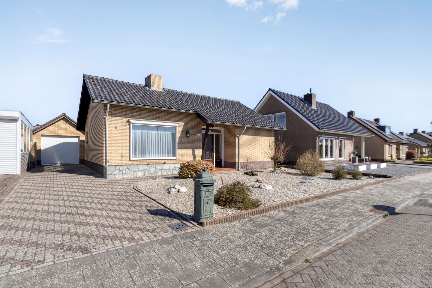 Vanaf de diepe, bestrate oprit via een, op afstand te bedienen sectionaaldeur, toegang tot de vrijstaande en verwarmde garage. Met een tegelvloer, spouwmuren en een zadeldak. Hier bevindt zich ook de aansluiting voor de wasapparatuur en een zoldertje.