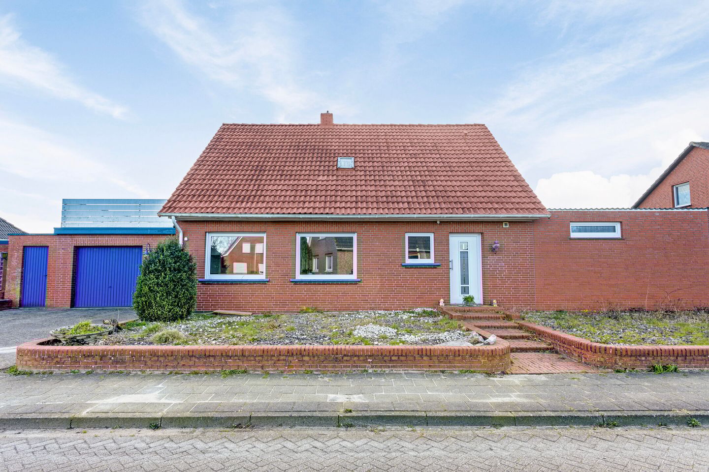 De voortuin is een siertuin met oprit naar de garage.