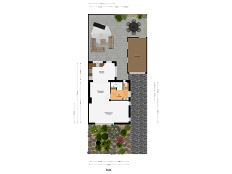 Vanuit de keuken is de grotendeels bestrate achtertuin te bereiken, gesitueerd op het noordoosten. De diepte van de tuin zorgt, samen met de lage bebouwing, dat er veel zon in de tuin is.