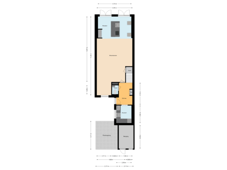 Entree met hal, garderobe, meterkast, toiletruimte met hangend toilet en fonteintje, trapopgang naar de 1e verdieping en doorgang naar de bijkeuken en woonkamer.