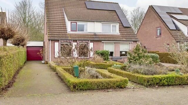 De achtertuin is praktisch aangelegd met een terras direct achter de woning. Verder naar achteren is er een gazon met aan de randen hagen als erfafscheidingen. Aan de achterzijde heeft de tuin bewust een open karakter waardoor je over de achterliggende weidegrond uitkijkt. Aan de voorzijde van de woning is er een diepe voortuin met naastgelegen oprit voor het parkeren van meerdere auto’s op eigen terrein.