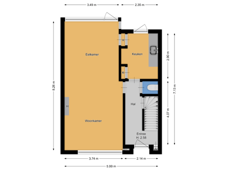 Entree met hal, meterkast, toilet en trap met trapkast. De ruime woonkamer met moederhaard heeft een deur naar de achtertuin. De dichte keuken is eenvoudig, maar biedt toegang tot de tuin en volop mogelijkheden om naar eigen smaak te moderniseren.