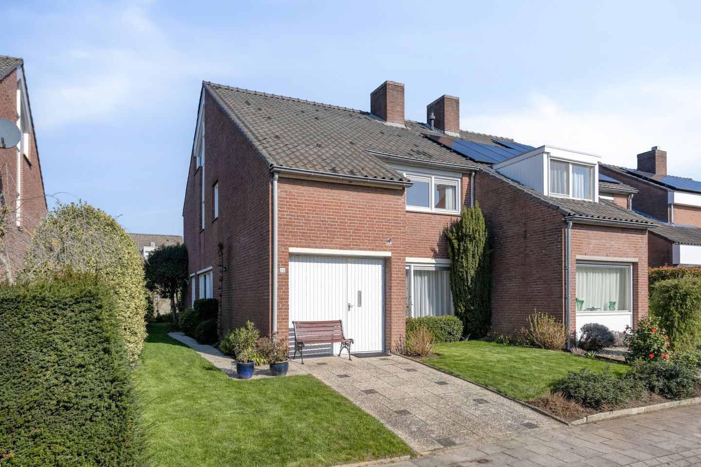 Beautifully landscaped front garden with lawn, hedges, and plants, and driveway to the garage. Access to the house and back entrance on the left via the side garden with walkway and lawn. The northwest-facing backyard has a paved terrace adjacent to the house, with lawn, plants, and espalier trees.