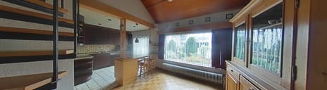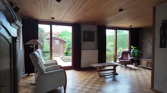 Via de entree/hal zijn de meterkast, het toilet, de trap naar de kelder en de leefruimte bereikbaar. De hal is voorzien van een donkere stenen vloer. Het toilet is volledig betegeld en uitgerust met een fonteintje. De zeer ruime doorzonkamer (ca. 56m²) beschikt over een mozaïekparketvloer, grote raampartijen en een open haard. Dankzij de twee schuifpuien in houten kozijnen is er direct toegang tot de tuin en valt veel daglicht naar binnen. De trap naar de eerste verdieping bevindt zich in de leefruimte. Aan de voorzijde is een sfeervolle vide aanwezig met een nokhoogte van circa 5,06 m, wat zorgt voor een ruimtelijk en licht karakter. De keuken (ca. 8m²), uitgevoerd in L-opstelling, is voorzien van een spoelbak, vaatwasser, oven en 4-pits inductiekookplaat. De ruimte beschikt over een plavuizen vloer en een bar met zitgedeelte. Aan deze zijde van de woning zijn kunststof kozijnen met HR++ beglazing geplaatst. Aansluitend aan de keuken ligt de bijkeuken met toegang tot de oprit. Hier bevinden zich de aansluiting voor de wasmachine en de keukenboiler (Daalderop close-in 10).