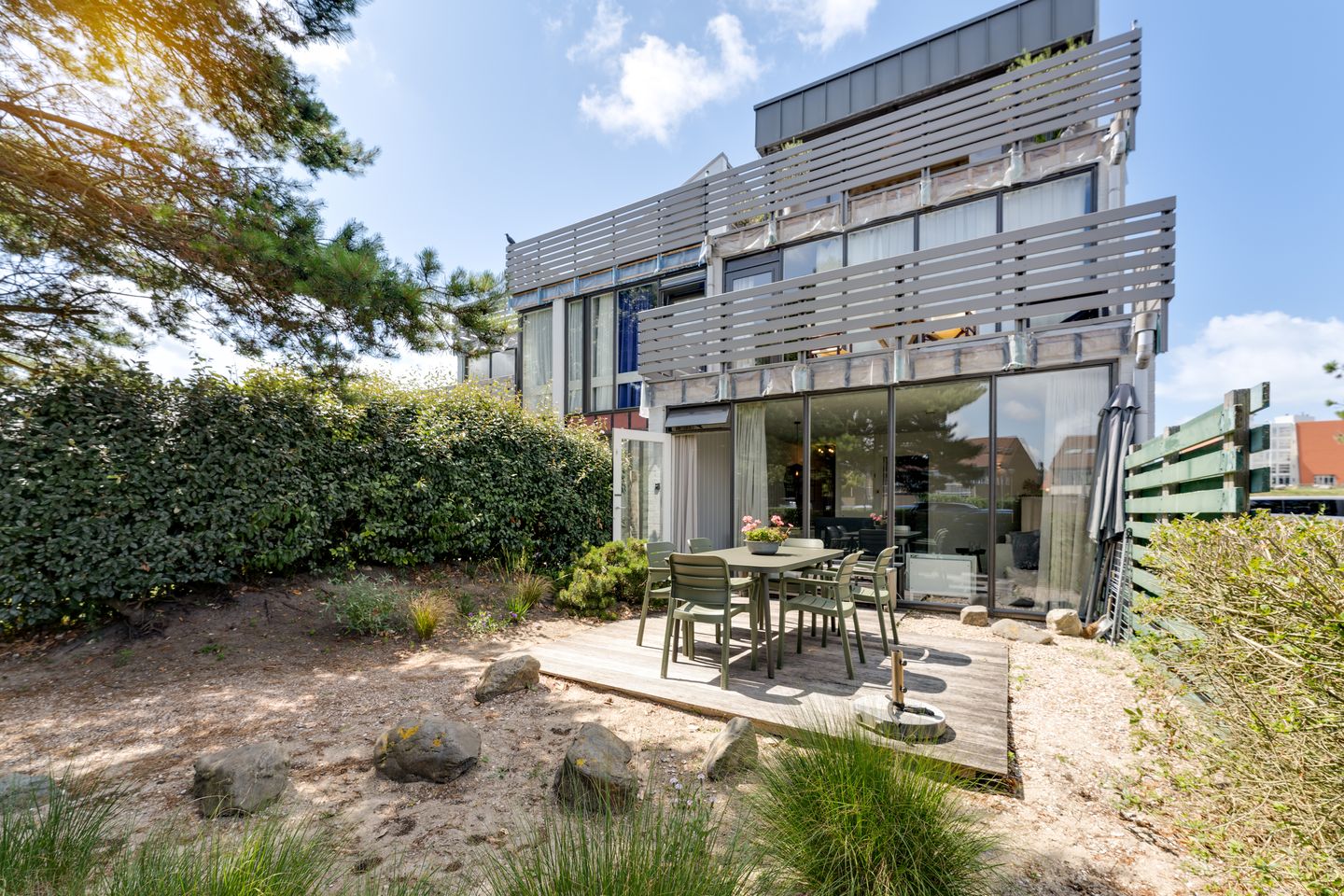 De tuin is een groot pluspunt van dit appartement. Dankzij de ligging op het zuidoosten geniet je hier van de ochtend- en middagzon, terwijl het groen rondom voor privacy en beschutting zorgt. Het terras is ruim genoeg voor een eettafel en loungestoelen, waardoor dit een heerlijke plek is om te ontbijten in de zon, lange zomeravonden door te brengen of simpelweg te ontspannen met het ruisen van de zee op de achtergrond.