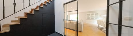 Je betreedt de woning via een royale, lichte hal waar meteen de karaktervolle trapopgang met smeedijzeren leuning in het oog springt. Dubbele stalen deuren geven toegang tot de indrukwekkende woonkamer met veel lichtinval door de grote raampartijen. Hier is alle ruimte om samen te komen met het hele gezin. Via de hal kunt u tevens de inpandige garage betreden.