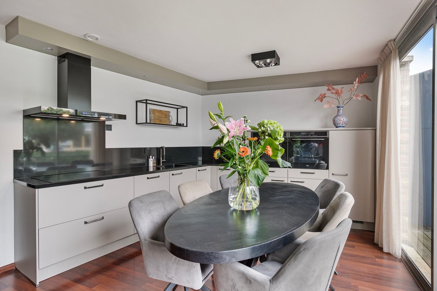 Entrance hall with meter cupboard (this has been expanded in 2023), staircase and access to the garage. This is equipped with an electrically operated garage door and there is a partition installed which again can be easily removed. In light colors tiled bathroom with sink. Door to the spacious kitchen with L-shaped kitchen placed in 2023. The taupe colored kitchen with dark granite top is fully equipped with an induction hob, black extractor hood, microwave, oven, dishwasher, apothecary cupboard and fridge freezer. Through the large sliding doors from the living kitchen is the terrace (NW) accessible, here is lighting and this is a wonderful place by the water. On the first floor is a laminate floor.