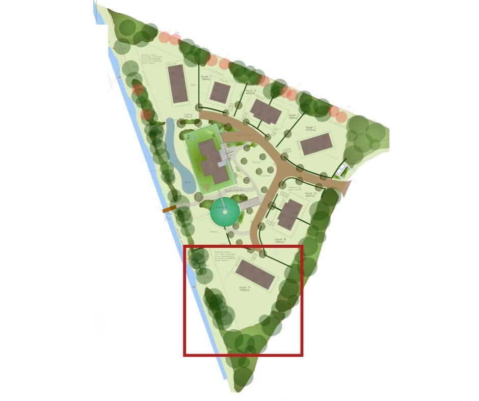 De kavel ligt beschut door de bestaande groenstructuur op de locatie en heeft een ruime tuin richting het zuiden. Deze hoekkavel grenst in westelijke richting aan de bestaande watergang, waar een doorkijk is gerealiseerd.