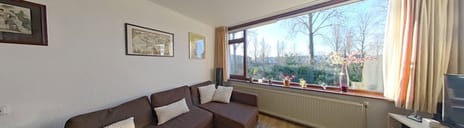 Aan de achterzijde bevindt zich de zonnige woonkamer met aangrenzend de zijkamer, momenteel in gebruik als werkkamer, die toegang heeft tot het balkon.