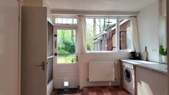 De doorzonwoonkamer is heerlijk licht en vormt een fijne leefruimte met uitzicht op zowel de voor- als achterzijde. De houten vloer geeft warmte en karakter, en dankzij het aanwezige rookkanaal is het mogelijk om een sfeervolle houtkachel of haard te plaatsen, perfect voor lange avonden met zicht op de tuin en het groen daarachter. Ook in de keuken bevindt zich een rookkanaal. De keuken is praktisch ingericht en voorzien van een wasmachineaansluiting.