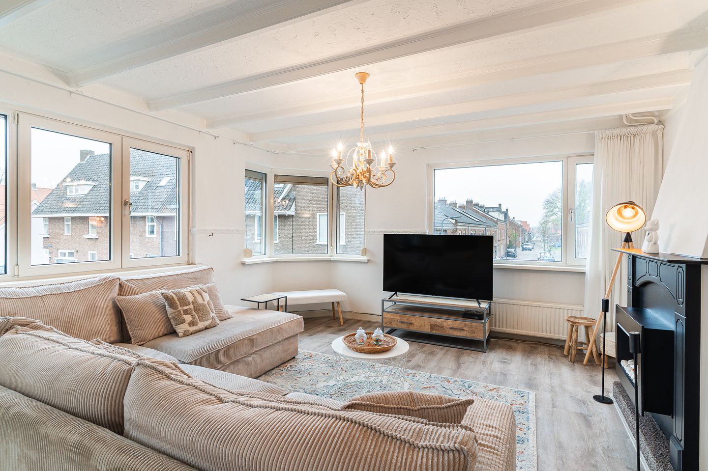 * Ruime woonkamer met fraai uitzicht over het plein
