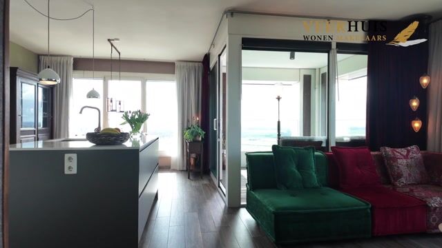 In de lichte woonkamer word je meteen gegrepen door het fenomenale uitzicht over de stad en de groene omgeving richting het zuiden en westen. De ruimte is hoogwaardig afgewerkt, met grote ramen die zorgen voor een overvloed aan daglicht. De schuifpui leidt naar de loggia, waar je volop kunt genieten van zon en uitzicht. De moderne keuken is voorzien van een stijlvol spoeleiland en inbouwapparatuur: vaatwasser, kookplaat, combi-oven, koelkast, vriezer, afzuigkap en spoelbak. Aangrenzend bevindt zich de praktische bijkeuken/berging.
