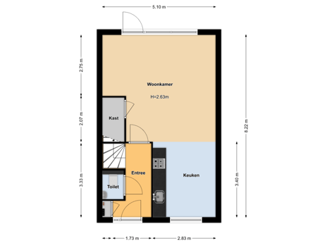 Entree, hal, wc met fontein, meterkast, woonkamer met pvc-vloer, moderne open keuken met vier-pits gasfornuis, afzuigkap, vaatwasser en oven. Trapkast met bergruimte, voor bijvoorbeeld keukenvoorraad, keukengerei en de stofzuiger. Deur naar de achtertuin. Vrijstaande berging en achterom naar gezamenlijke achtergelegen pad.