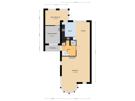 Entree, hal, toilet met fonteintje, een ruime L-vormige living met openhaard en fraaie halfronde erker met veel lichtinval. Vanuit de woonkamer is de open woonkeuken bereikbaar, met een schuifpui naar de tuin en aansluitend een studeer-werkruimte. Vanuit de studeer-werkruimte is de ruime berging – bijkeuken bereikbaar.