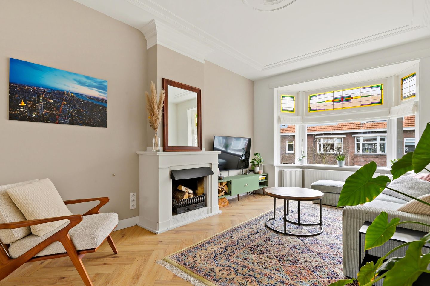 DELIGHTFUL DOUBLE UPPER APARTMENT of 125m2 in the highly sought-after VRUCHTENBUURT where AUTHENTIC DETAILS have been preserved, such as the en suite sliding doors, STAINED GLASS windows, ornamental ceilings, and fireplaces! The property was renovated in 2021, features a fantastic (licensed) ROOF TERRACE of 22m2, two spacious south-facing balconies, an ENERGY LABEL 'C' and is ready to move into immediately!