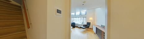 You enter the hall, after which you step into the bright living room. The wooden floorboards and tall windows create a warm, inviting atmosphere and an abundance of natural light. From here, you have a lively view of the Bilderdijkstraat and Vondelstraat. The living room also has a storage cupboard under the stairs.