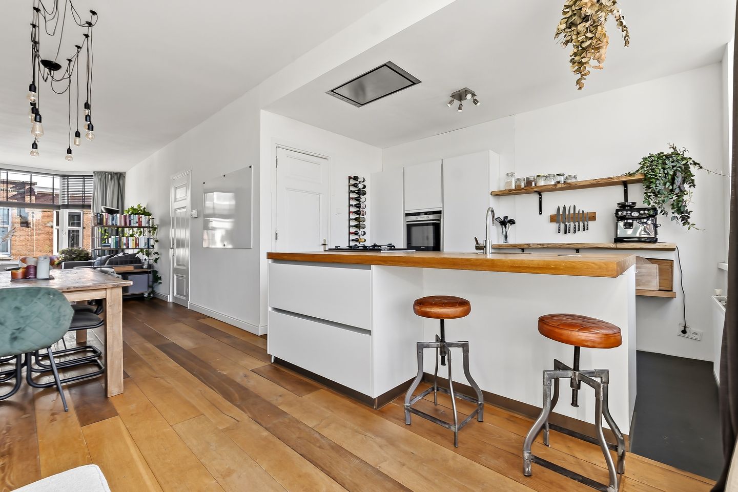 The generous through-living room with open kitchen is a true eye-catcher. High ceilings and large windows create an even greater sense of space and light. The open kitchen at the rear features a cooking island with bar and various built-in appliances, seamlessly combining cooking and living.