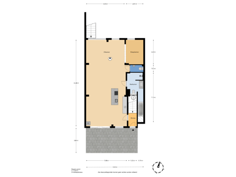 At the rear, a (bed)room with adjoining bathroom featuring a shower and washbasin.